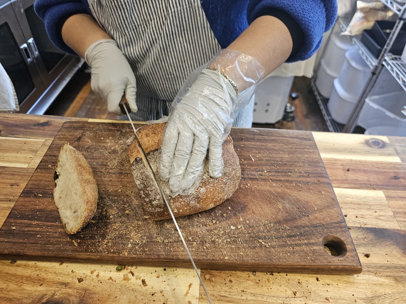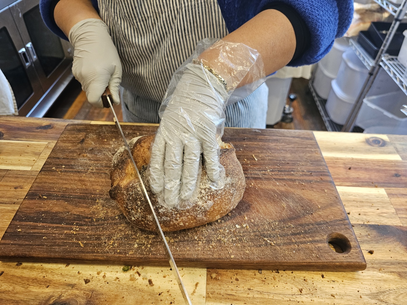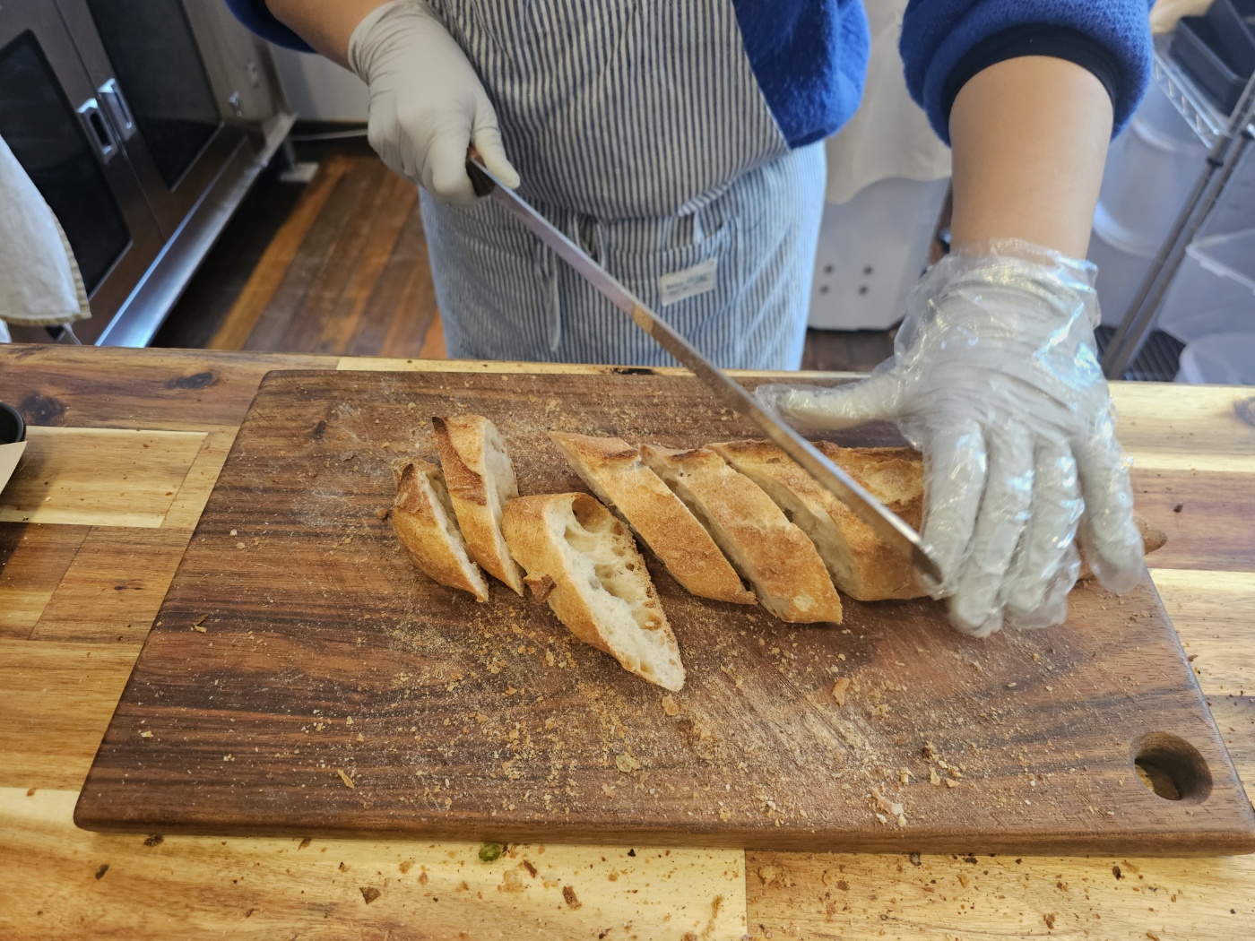 빵 컷팅하면서 모든 빵을 컷팅 안하는 사유가 일부의 빵에는 내용물이 들어가 있고 일부는 없는 빵이어서 그에 맞게 보관 방법 및 먹는 방법을 설명해 주시고 빵을 컷팅해주셨읍니다.